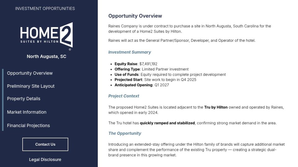 Raines Company is under contract to purchase a site in North Augusta, South Carolina for the development of a Home2 Suites by Hilton.